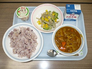 今日の五穀米は、大麦、発芽玄米、黒米、もち黍、赤米の5種類を白米と一緒に混ぜて炊きました。五穀には体を作るミネラルやおなかの掃除をしてくれる食物繊維が多く含まれるので、普通のご飯よりも体に良いと思います。しかし、五穀ご飯が苦手な人もいるかもしれません。それで、みなさんに食べてもらいやすいカレーにしました。カレーには、秋にとれるおいしい食べ物がたくさん入っています。探しながら楽しんで食べてください。