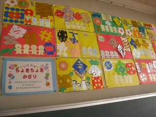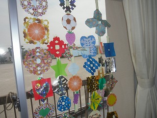 1年生が折り紙を折ったり切ったりして作った作品が教室に掲示してあります。窓ガラスに掲示してあるのは、まるでステンドグラスのようです。
