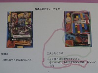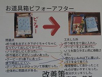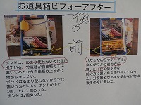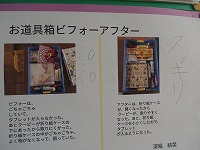 5年生が家庭科で学習した整理整頓についての学習で、自分のお道具箱の整理する前と後を比較してまとめたものが掲示してありました。その名も「お道具箱ビフォーアフター」。整理する前の写真を撮り、その問題点をまとめたあと、どうすればよいか改善点を考え実践してみます。ただ何となく片づけるのではなく、自分の意図するところを記録することで、その後にフィードバックすることができるようになります。