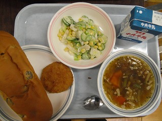 今日の献立にはレーズンロールパンがあります。いつものパンと違うのは、レーズンが入っていることです。レーズンとはブドウを乾燥させたもので「干しブドウ」とも呼ばれます。