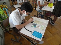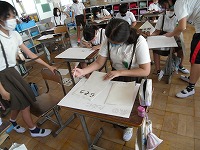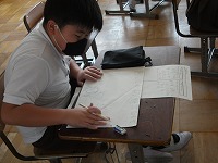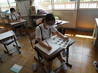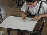 6年生が図工でポスターを描いていました。ふつうの絵画と違うところは文字が入ることです。6年生は昨年の総合学習の中でレタリングを学んでいますので、このポスターでも、自分の使いたい言葉をどんな活字にするか考えて、レタリングしていました。