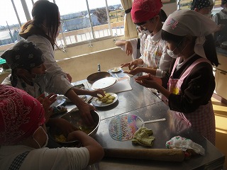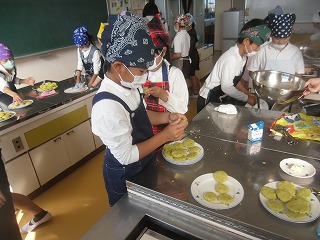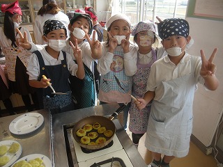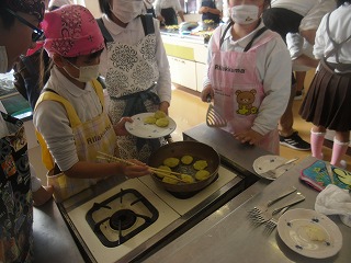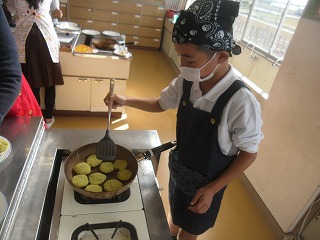 4年生は、イモを茹でて、つぶして、まぜて、丸く平たくしてフライパンで焼きながらしょう油等で味付けていきました。