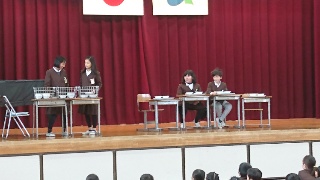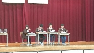 今朝は、給食委員会が給食についてみんなに伝える給食集会でした。劇の形式で、給食を食べる時の注意などについてみんなに教えてくれました。