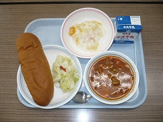ロールパン 牛乳 ポークシチュー イカとカリフラワーのマリネ フルーツババロア