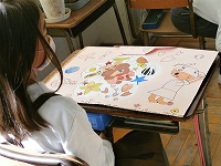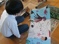 窓を開いたときに、台紙の白と窓の色に重なる絵が同じ色を塗っても違って見えるので、同じ色に見えるように微妙に色を変えるなど工夫していました。