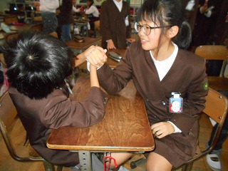6年生が、学級レクで腕相撲大会をしました。この時期は男女の体格差が一方的でないので、組み合わせ次第でだれでも上位に進出できる可能性があります。一試合ごとに声援や歓声が上がり、とても盛り上がりました。