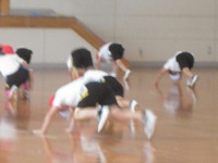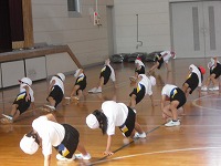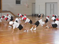 2年生が、体育の準備運動で体力づくりをしていました。みんながそろって同じ動きをしていると、運動会の組体操のようにも見えました。