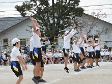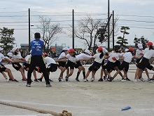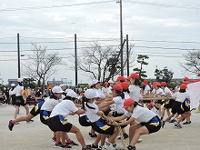 高学年競技の「ポイント綱引き」は依然紹介したように、綱についている3つのポイントのうち2つを自陣に引っ張り込んだチームの勝ちです。どのポイントを狙うか勝負の前に作戦タイムを取り、素早くポイントをめがけて走り出しました。