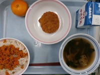 金芽ロウカット玄米ご飯 牛乳 人参そぼろふりかけ 蓮根サンドフライ のっぺい汁 みかん