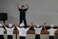 4年生が体育で、ダンスの練習をしていました。体育館で間隔を広く取って、音楽に合わせて踊ります。先生が舞台の上で見本を見せて一緒に踊っていました。