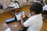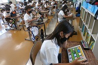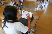 3年生がタブレットで漢字練習に取り組んでいました。書き順があっているかも判定します。中には、まだ習っていないような漢字にまで挑戦している子もいました。