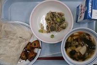 越津ねぎの五目きしめん 牛乳 大根とツナの青紫蘇和え 大学いも