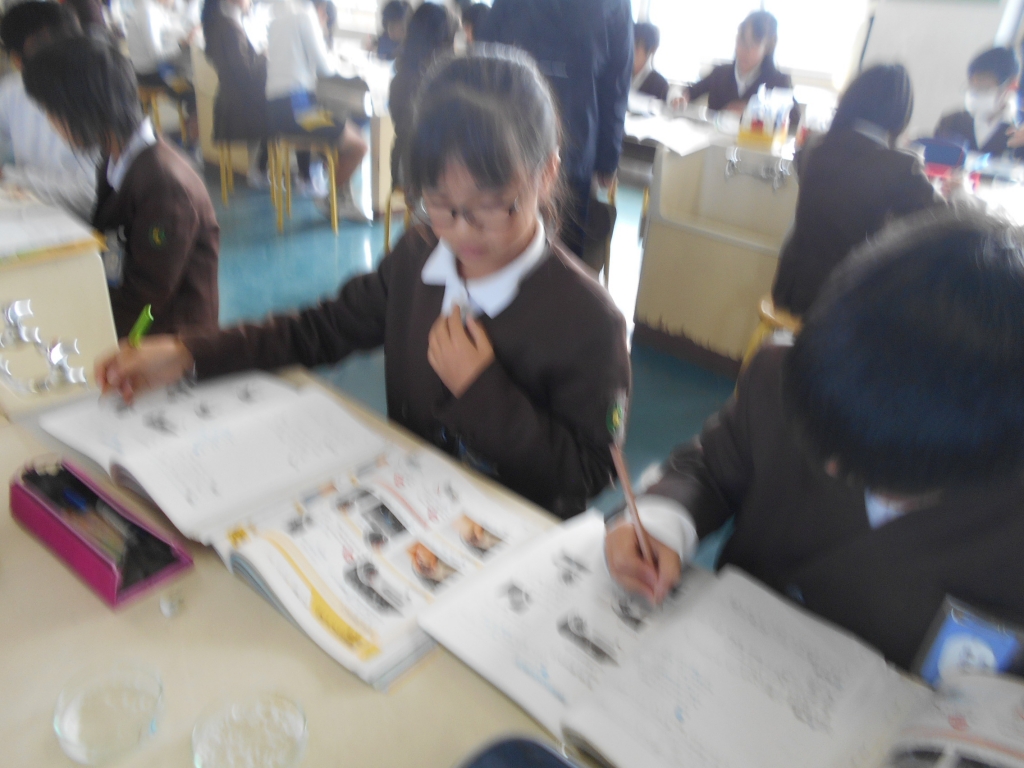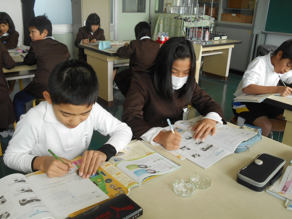 5年生は、水溶液を自然蒸発させ、ミョウバンと食塩を取り出しました。