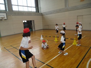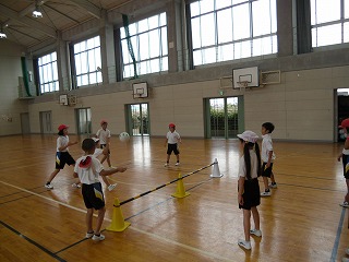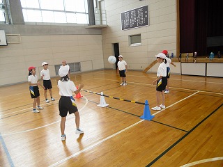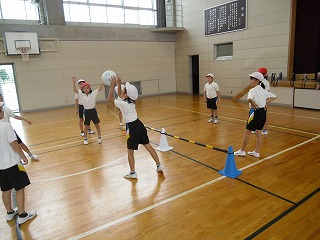 先日紹介した3年生のソフトバレーですが、ずいぶんうまくなってきました。味方の中で3回バウンドさせてパスを回し、相手コートに返します。どこにバウンドさせると見方がとりやすいか考えて、ボールのコントロールができるようになってきました。