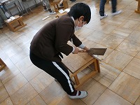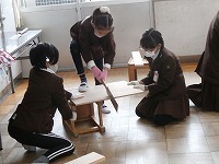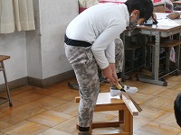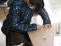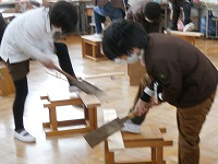 4年生が図工で木工に挑戦しています。のこぎりで木の部品を作り、金づちと釘で組み合わて打ち付けます。どんなものを作るか計画を立てて、木の長さを計り、まずはのこぎりで切っていました。台の上にどのように置き、のこぎりをどのように持って、どんなふうに切ると切りやすいか、何度もやっていくとわかってきます。