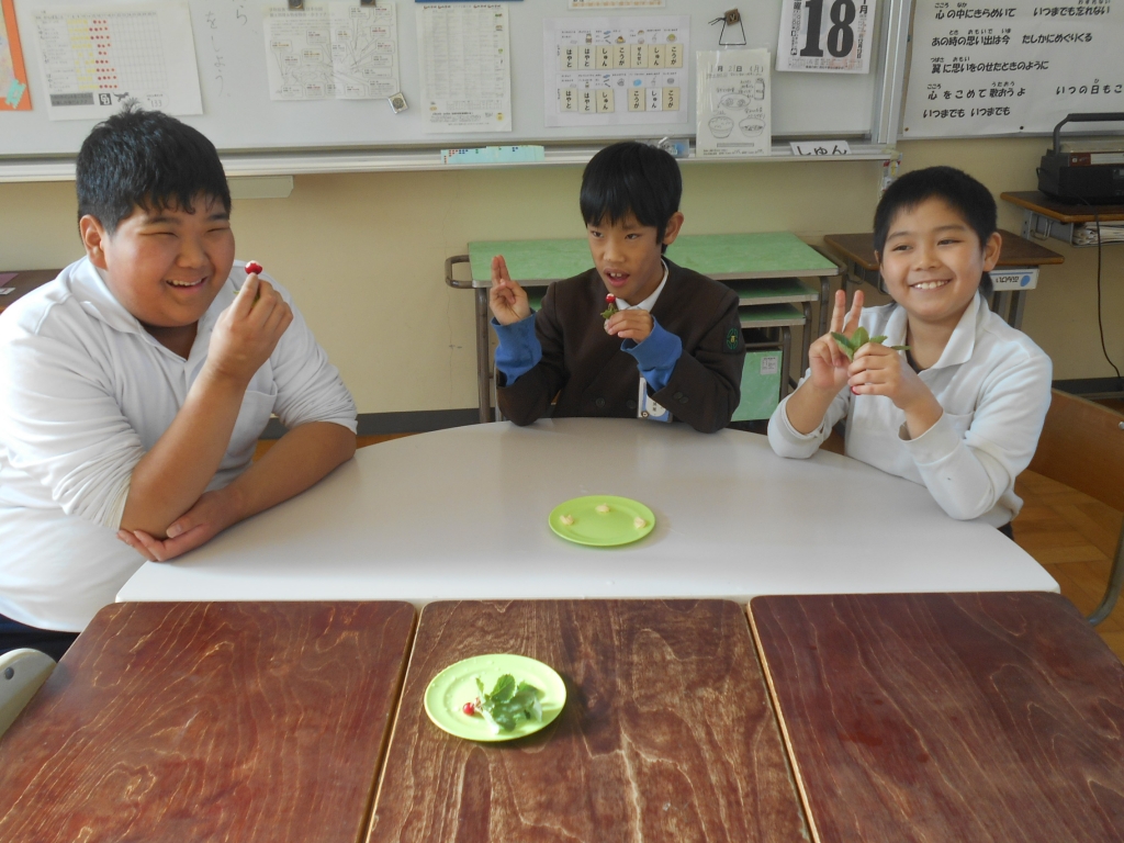 ひまわり学級では、授業参観での発表会の練習をしました。その後、11月に種をまいて育て、収穫した二十日大根をおいしくいただきました。