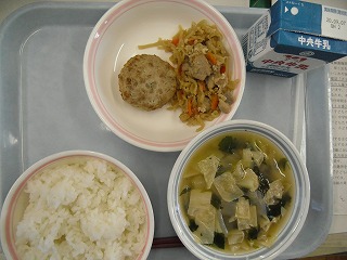 ご飯 牛乳 米麹入りハンバーグ 切り干し大根の炒め煮 湯葉の澄まし汁