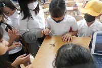 3年生がとても興味をもち、すぐに図書室の図鑑を調べたいと言ったので、昆虫の図鑑を調べたところ、胴体の形(腹の部分の付け根が細くなっていることと、尾の先が二つに分かれていること)や模様(斑点のつき方)、大きさ(全長5~7cm)や生息分布(北海道~沖縄まで全国)など、様々な条件から「