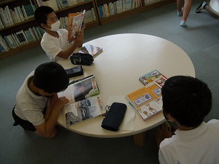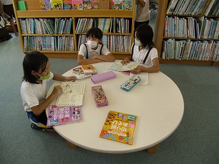 3年生が社会で、いろいろな仕事について調べていました。上の人に聞いたり、図書館で本を調べたりします。今日は、夏休み前なので調べると同時に、夏休み用に借りる2冊の本も探していました。