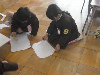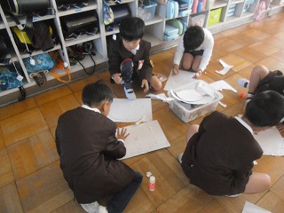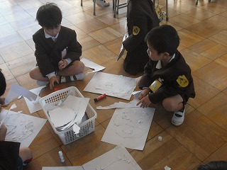 1年生が、版画をしています。版画といっても、木版ではなく紙版画です。手で自由に紙を破り、顔を作るように貼っています。