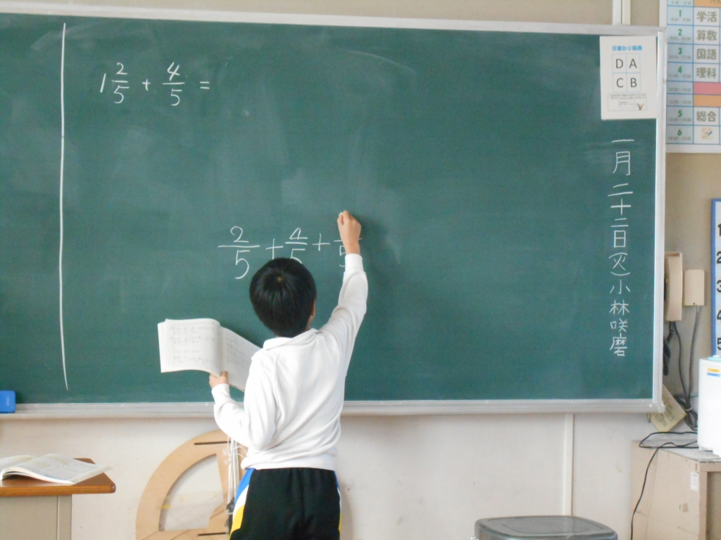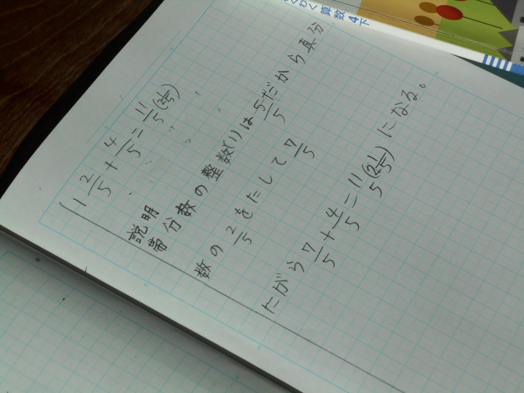 4年生は、算数では、分数の足し算について学習中です。帯分数+真分数の計算について考えました。