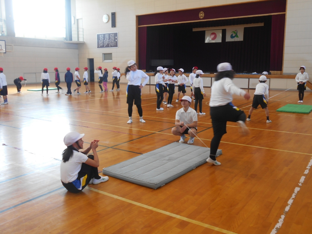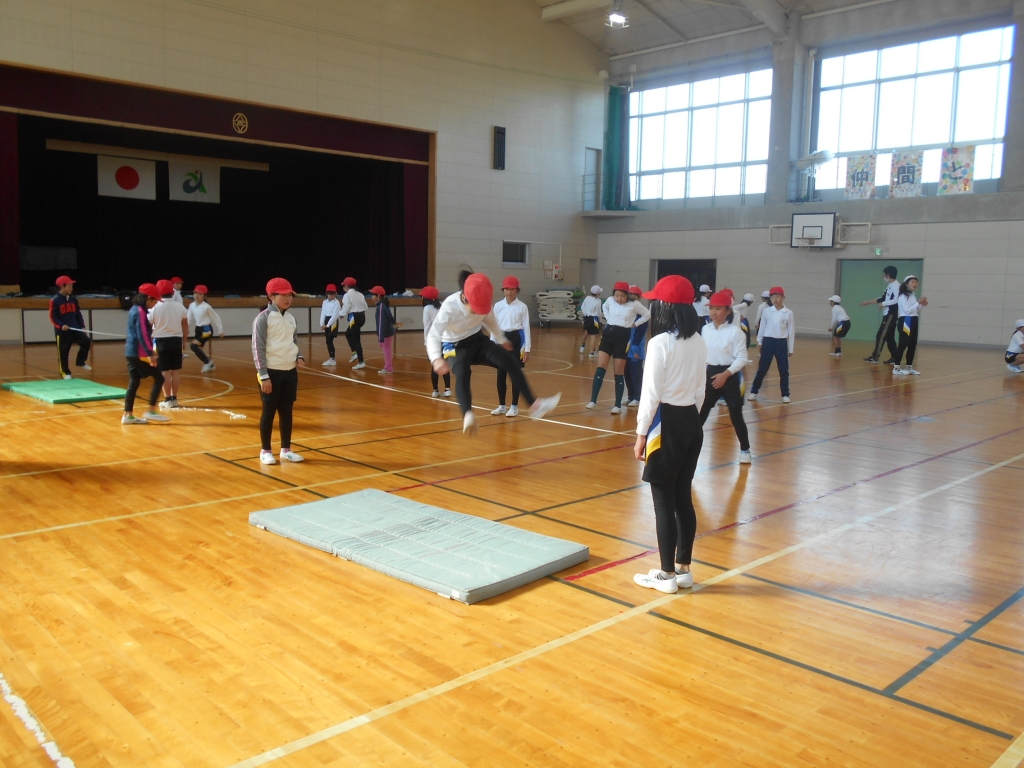 体育では、高跳びの練習をしています。まず、ゴム跳びでコツをつかみます。