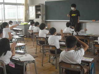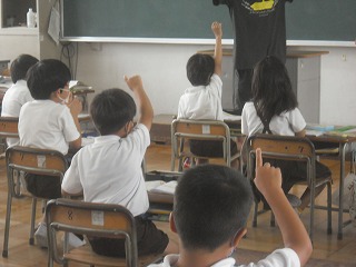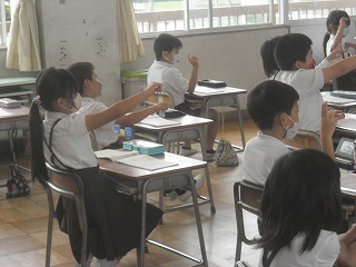 2年生が国語で漢字の練習をしていました。みんなで指を空中にあげて同じタイミングで書く練習をしてから漢字ドリルで実際に書いていました。