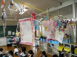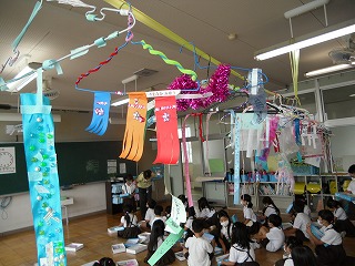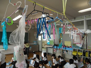 」が完成し、1年教室に飾ってあります。室内ですが、扇風機が風を送っているのでゆらゆらとかわいく揺れています。
