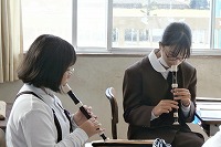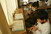 5年生が音楽で学習していたリコーダーアンサンブルのテストに挑戦していました。自分の番が来るまで、子どもたちは別室で「黙々」ではなく、「ピーピー」とパートに分かれて音を合わせていました。