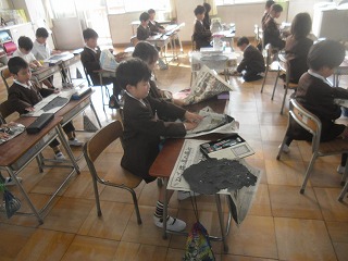 1年生が、作品展の紙版画のもとを持ち帰るために、ていねいに新聞紙に包んでいました。うまく包むために工夫している様子がとてもかわいいです。