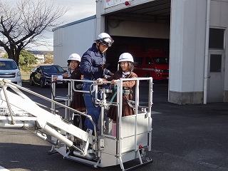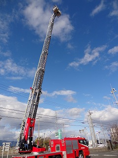 まず、はしご車体験です。それぞれがバケットに入り、はしごをのばしてもらいます。高さは30mで、10階建てのビルの高さだそうです。