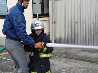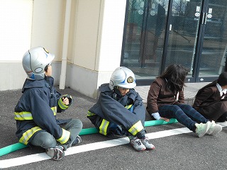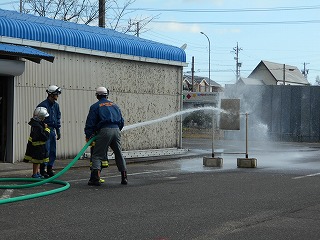 そして、放水。くるくる回る的をねらいます。小さな消防士の気分はどうかな?