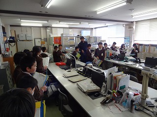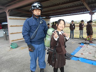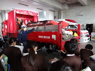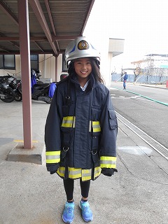 次は放水体験。最初に消防車の説明を聞き、消防服を着ます。