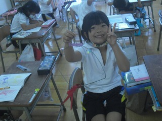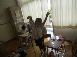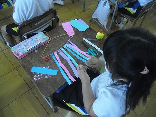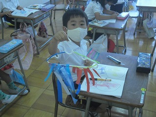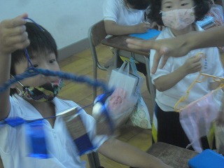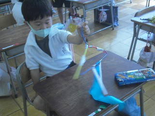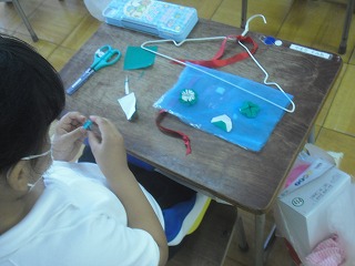 1年生が図工で、風でゆらゆら揺れる飾りを作っていました。ハンガーに、いろいろな色の折り紙や布、モールなどをいろいろな長さに切って貼り付け、ぶら下げて揺れるようにします。