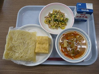 もやしには3種類あるのを知っていますか? 給食でよく使うもやしは「緑豆もやし」という種類です。くせのない味で和え物や炒め物などにします。緑豆もやしよりも細いものを「ブラックマッペもやし」といい、ほのかな甘みがあります。そして、今日の給食のナムルにつかわれているのは、「大豆もやし」です。もやしの先に、大豆の形がそのまま残っているのが特徴です。コリコリとした食感で食べ応えがあります。中華料理に使われることが多いです。今日は、ハムと水菜と一緒にナムルにしました。