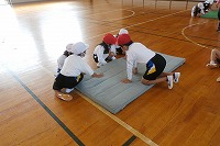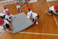 1年生・体育のマット運動の時は、みんなで協力してマットの準備をします。運んだあと必ずやること・気を付けることは、マットの「耳」つまり、マットを運ぶための持ち手の輪をマットの下に折り込んで、足が引っ掛からないようにすることです。