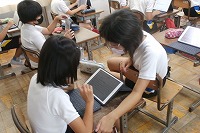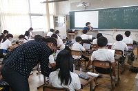 5年生が英語で、(〇〇できる)という意味の「can」の学習をしていました。自分が言いたい「can」を入れた文章を考えて、先生やALTの先生に確かめたり教えてもらったりしていました。