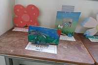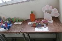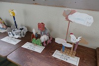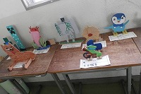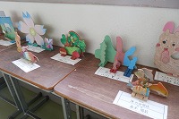5年生が図工で取り組んでいた木工作品が完成して教室前に展示してあります。糸鋸をうまく使って様々な形に切った板は、それぞれオリジナリティーがあって楽しく作られています。色も、原色そのままではなくいろいろな色を混ぜて、グラデーションなど工夫して塗ってあります。