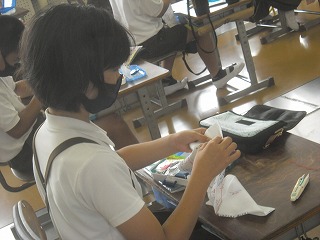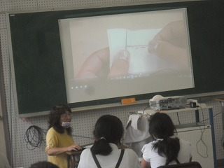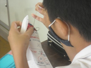 5年生が家庭科で、玉結びや玉留めの練習をしていました。最初にプロジェクターでやり方のビデオを見てから一人ひとりが自分の布に練習していきます。玉結びをしてもなかなか玉ができなかったり、玉止めをしてもちょうどいい位置に結び目ができなかったりと何度も苦労しながら繰り返し練習していました。