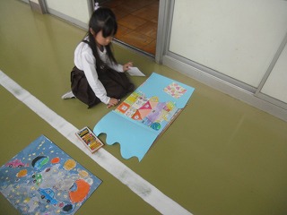 扉の形も、扉の中の絵もいろいろで、扉の外側や内側にもいろいろな飾りがついています。机の上では置けないので、床に広げて描いていました。