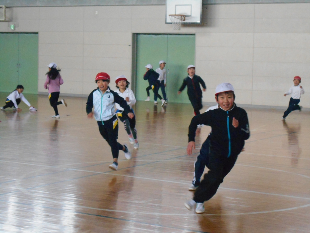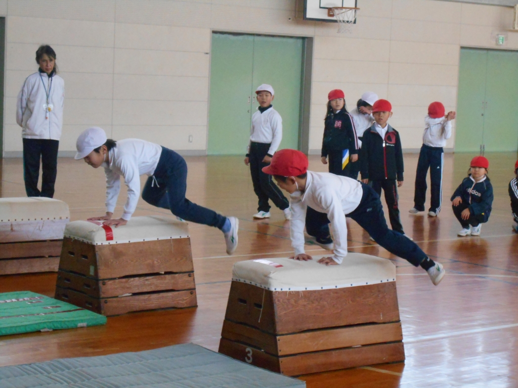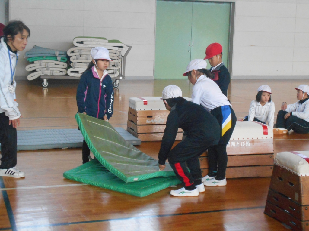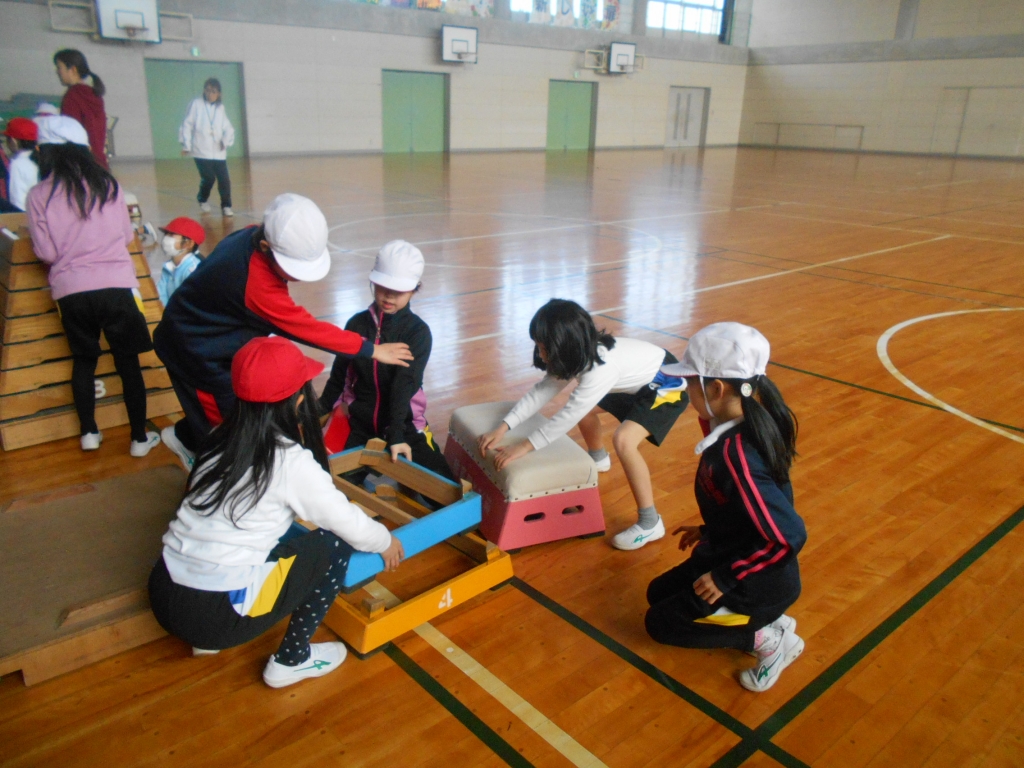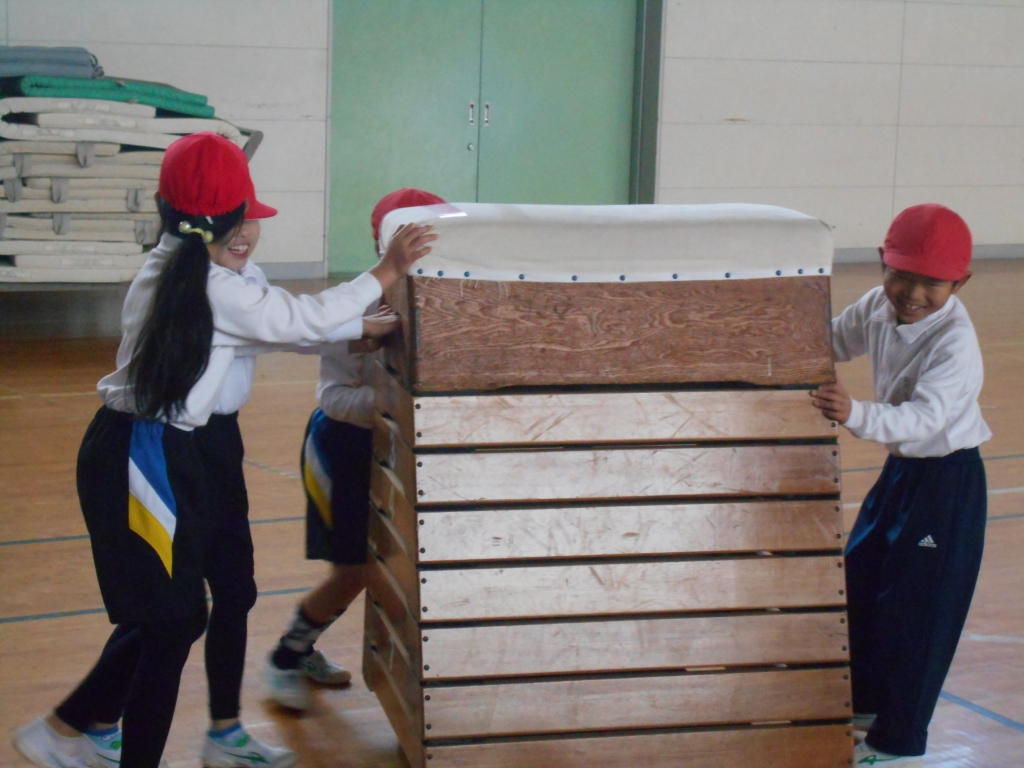 2年生は、体育で帽子とりをしました。そのあと、みんなで跳び箱の準備をして、またぎ乗り、またぎおりをしました。