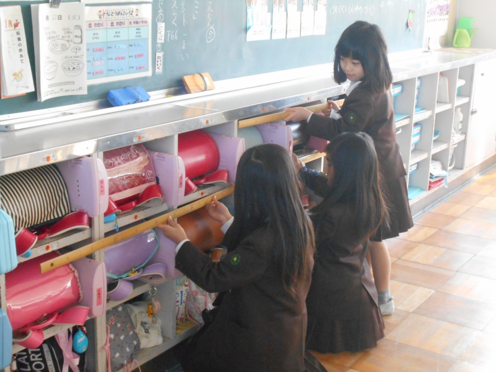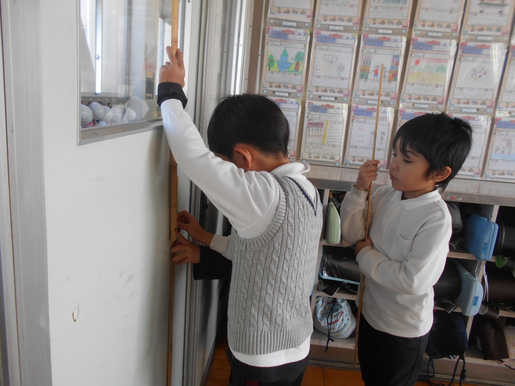 算数では、1メートルものさしを使って、今日は、ドアやロッカーの長さを測りました。