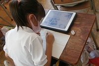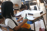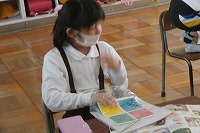 2年生が図工で、ステンドグラスのようにカラフルに光をすかして輝く作品を作ります。まずはデザインを決めて、赤青黄緑の接着剤付きセロハンを切りぬき、透明なプラスチックの板に貼りつけていきます。
