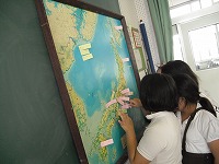 5年生は、食料の生産について学習していますが、家で食べている食料について、いろいろな生産地を調べるために、家からいろいろな食料のラベルやパッケージをもってきています。それらを付箋に書いて日本地図に貼り、どんなものがどこで生産されたものかをまとめています。