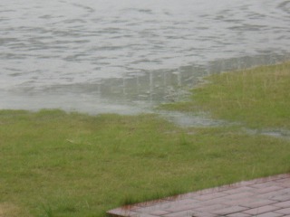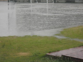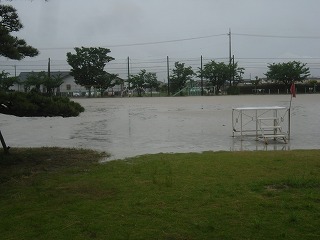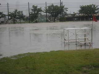 午後5時過ぎの運動場のようす。 雨で冠水しているところが増えています。
