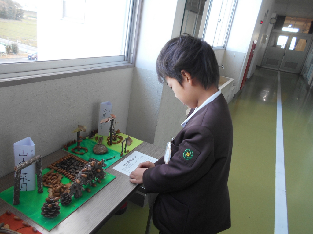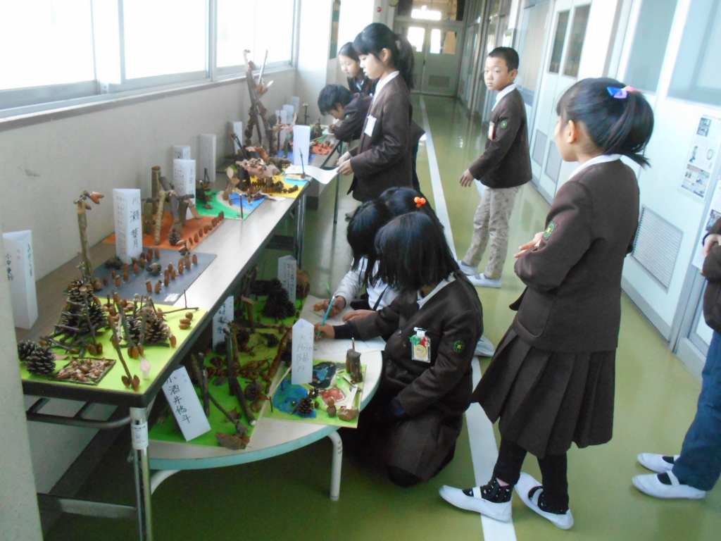 4年生は図工で、友達の作品を鑑賞しました。自然の中から拾ってきたものを使った作品の工夫や良い所を見つけました。