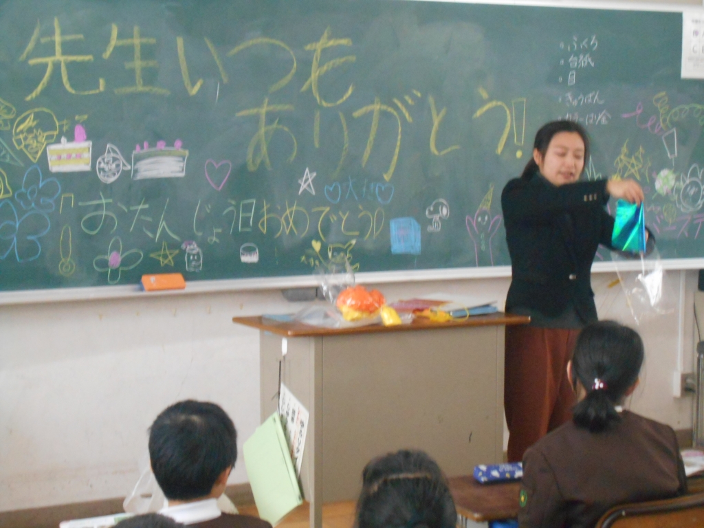 今日は、先生の誕生日です。休み時間にみんなで黒板に、先生へのおめでとうのメッセージを書きました。