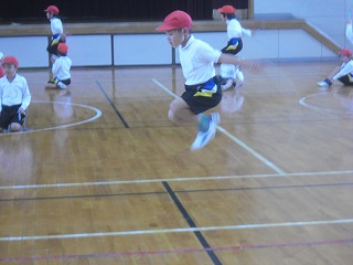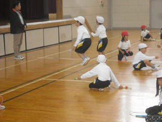 1年生の体育でなわとびが始まりました。みんなある程度は跳べるのですが、これから長く連続で跳ぶために、1回縄を回す間にリズムを取って2回跳ぶやり方から、1回回すごとに1回跳ぶ跳び方へと修正していきます。将来2重跳びや3重跳びに挑戦していくためにはとても重要です。ご家庭でも練習してくださいね。