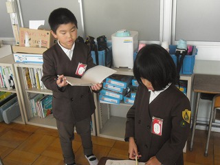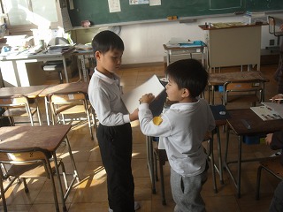 1年生の国語は「インタビューをしよう」です。聞きたい内容を、相手に失礼のないようにうまく質問し、分かりやすくメモする。態度や言葉遣い、そしてまとめる力など、さまざまな能力が必要です。まずはクラスの友達同士でインタビューしあっていました。
