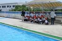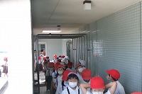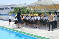 今日は3年ぶりのプール開きです。プールに入りたいのはやまやまですが、1年生2年生はまだ西川端小のプールを知りません。それで、まず、先生から説明を聞いたうえで、実際にプールの設備の見学をして、実際にプールを使う時のシミュレーションをしました。